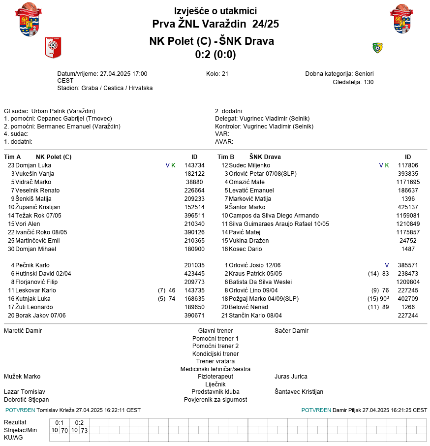 Drava je uzela skalp na kraju 21. kola Prve ŽNL Varaždin jer su u Cestici bili bolji od vodećeg Poleta. To je iskoristila Nova Ves Ecoagro i pobjedom se približila na samo tri boda zaostatka. Važne bodove u borbi za opstanak osvojila je Mladost iz Varaždinskih Toplica, dok se varaždinska Mladost morala zadovoljiti s jednim. Plitvica je na gostovanju bila uvjerljiva protiv Zadrugara, dok je Obreš kod kuće svladao Beretinec.