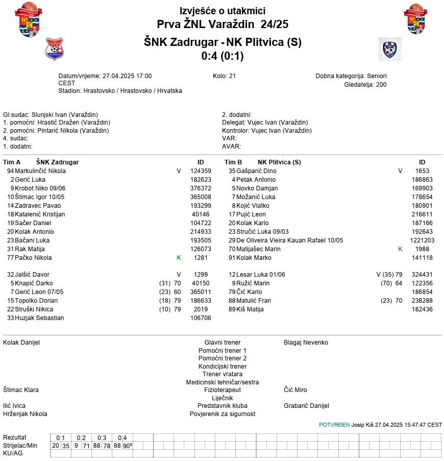 Plitvica je lakše nego očekivano odradila gostovanje u Hrastovskom i s četiri pogotka pobijedila Zadrugar. Jedini pogodak u prvom dijelu zabio je Karlo Kolak, a sljedeći je došao tek u 71. minuti kada je prednost gostiju povisio Marin Ružić. Fran Matulić je neposredno po ulasku u igru treći put matirao domaćeg vratara, a do kraja susreta dodao je još jedan pogodak za konačnih 0:4.
