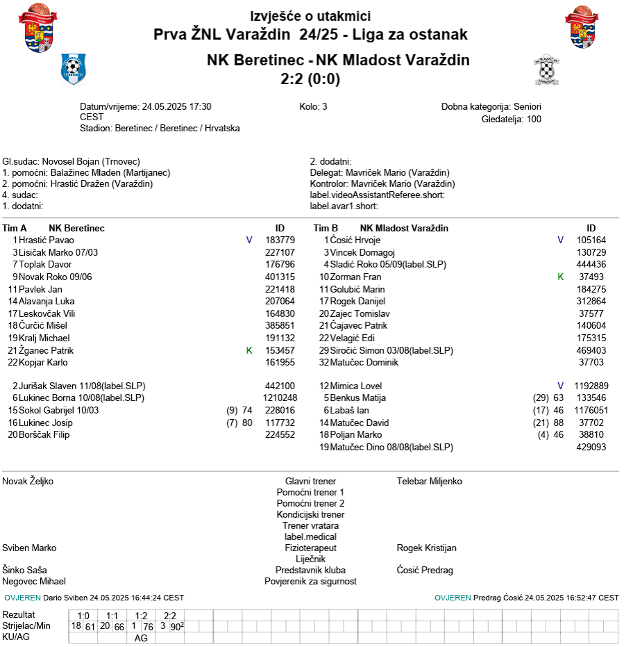 Beretinec je iščupao bod protiv Mladosti iz Varaždina i sačuvao nade za ostanak u ovom rangu natjecanja. Iako su prvi poveli preko Mišela Čurčića, Mladost je brzom reakcijom Tomislava Zajeca izjednačila, a potom autogolom domaćeg vratara Hrastića stigla do prednosti. Bod za Beretinec morao je spašavati Marko Lisičak u posljednjoj minuti utakmice.