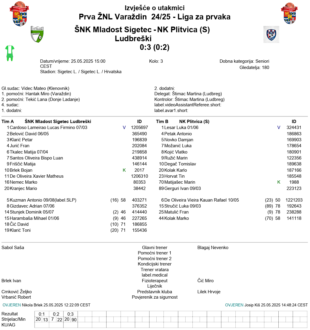 Mladost ni u Sigetecu Ludbreškom nije uspjela popraviti lošu krvnu sliku od starta lige za prvaka jer je ponovno poražena. Bolja od nje bila je Plitvica s tri postignuta pogotka. Karlo Kolak i Luka Možanić zaslužni su za nove bodove Plitvice na strani.