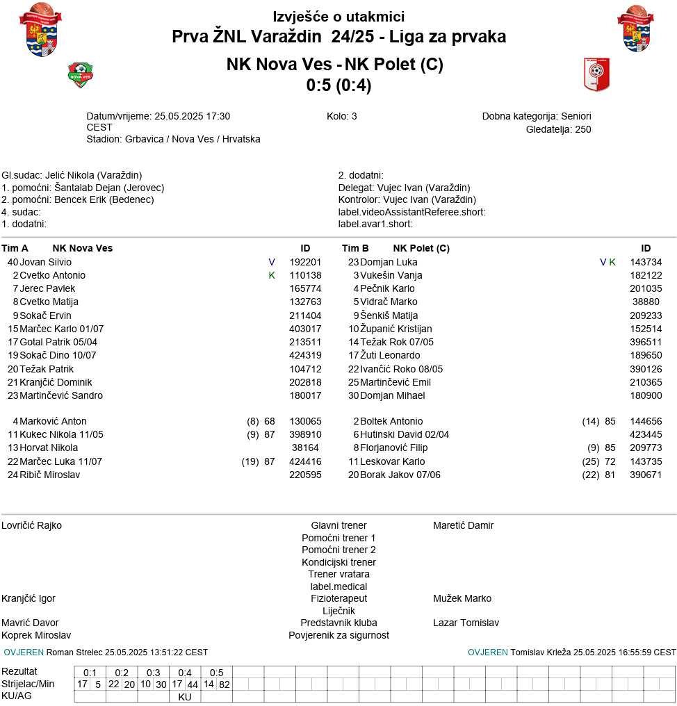 Polet je u derbiju trećeg kola lige za prvaka deklasirao Novu Ves i okrunio se titulom najbolje momčadi Prve ŽNL Varaždin. Shvatili su nogometaši Poleta važnost ove utakmice od samog starta i istu odlučili riješiti već u prvom poluvremenu. Leonardo Žuti, Roko Ivančić i Kristijan Županić redom su se upisivali u strijelce do predaha, a Rok Težak potvrdio je pitanje pobjednika i prvaka na kraju susreta.