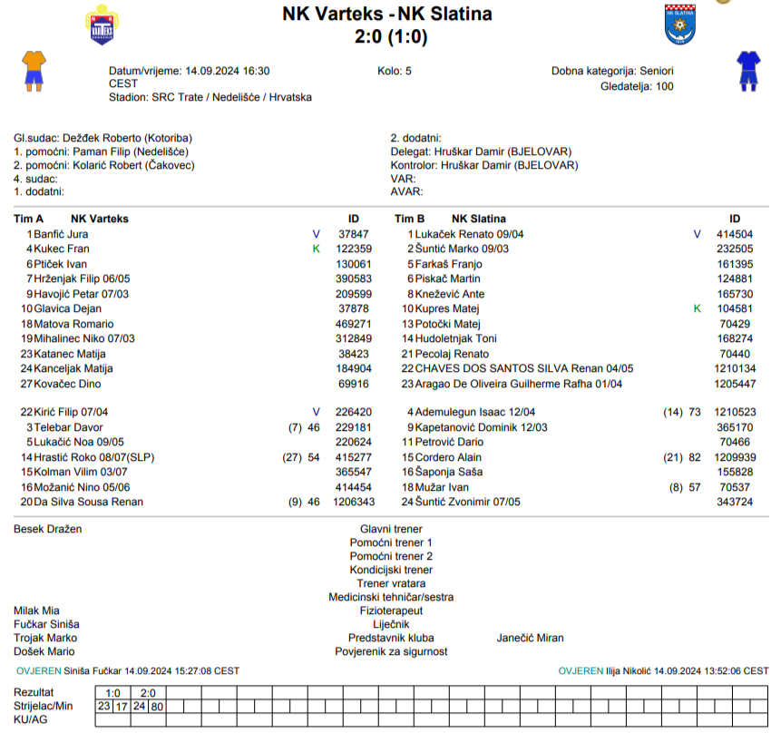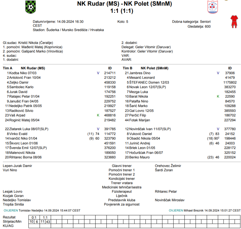 Derbi utakmica po kišnom vremenu završava podjelom bodova, a mi po viđenom, možemo itekako više žaliti od protivnika. Odlično, agresivno ulazimo u utakmicu koju otvaramo s dvije odlične šanse iz prekida koje na našu žalost završavaju na stativi i pored vrata gostiju. Kontroliramo utakmicu i stvaramo velik broj prigoda, no danas je izostalo realizacije. Protivnik dolazi do vodstva nakon jednog dalekometnog udarca gdje lopta u gužvi mijenja smjer i vara našeg vratara Kodbu. I nakon toga, namećemo se u igri kao bolja momčad koja stvara odlične prigode te to dolazi na naplatu nakon jednog kornera gdje lijepo poentira P. Nedeljko. Rezultatom 1-1 odlazimo na odmor. Izlaskom na teren, u 46 minuti propuštano obećavajuću prigodu. Čvrstom i kompaktnom igrom u fazi obrane ograničavamo protivnika na tek 1-2 poluprilike, dok mi opet stvaramo zavidan broj, neiskorištenih prilika. U 65 minuti Ivančić biva srušen u kaznenom prostoru, po mišljenju većine, za čisti jedanaesterac. No kako na višu silu ne možemo utjecati, prepustiti ćemo takve situacije onima koji su odgovorni za iste. I nakon toga imamo kontrolu u igri te ne iskorištavamo još 2-3 dobre prilike za postizanja pogotka. Mišljenja sam da gost može ovakvim ishodom biti daleko zadovoljniji, no bilo kako bilo, na kraju se i mi moramo zadovoljiti samo bodom. Čestitao bih svojim momcima na angažmanu i na odličnoj utakmici, a Nk Poletu želim sreću u sljedećim utakmicama. Čeka nas kup utakmica u srijedu te smo mislima već na istoj – Damir Lepen Jurak Rudar.