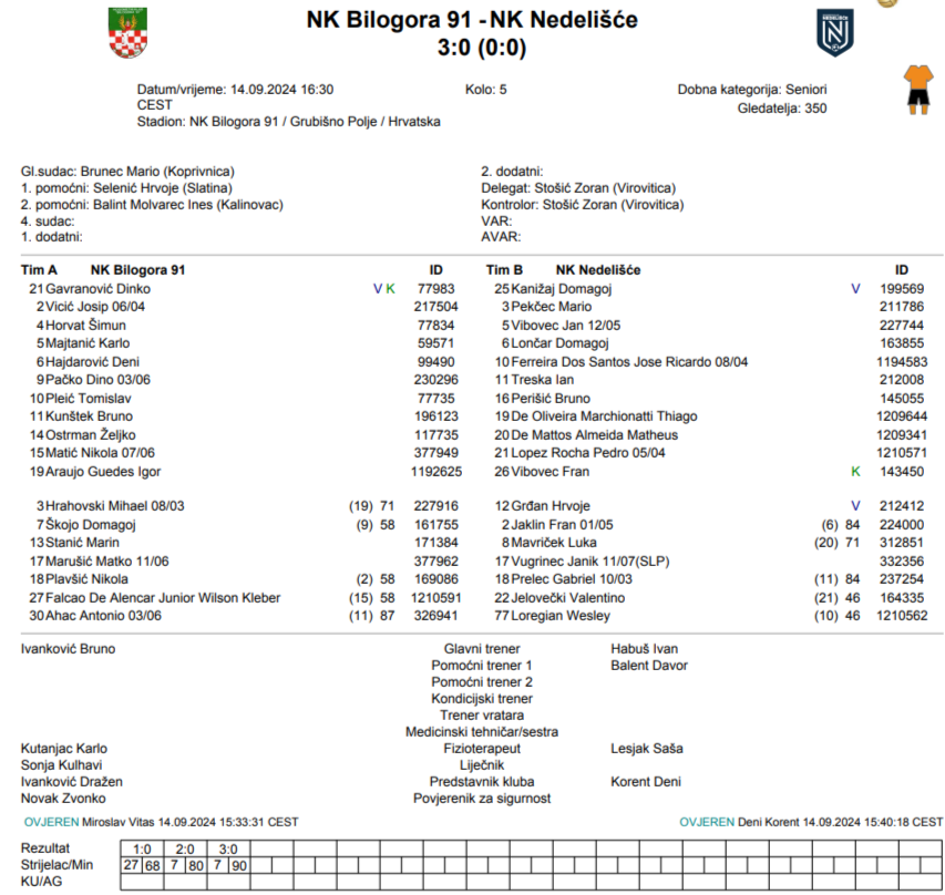 Jako dobra utakmica sa obje strane. U prvom poluvremenu smo jedni i drugi tražili da dolazimo u završnicu kroz pas igru. Domaćin se tu malo bolje snalazio ali mi smo imali neke situacije iz kontre i polukontre gdje smo mogli i trebali biti opasniji. Domaćin u drugo poluvrijeme ulazi ofanzivnije sa više rizika ali i mi odgovaramo dobrom igrom i dolazimo u situacije gdje bi trebali biti bolji u ofenzivnom smislu. Nažalost, u 60.minuti ostajemo sa igračem manje, nakon toga domaćin lakše dolazi u završnicu i nakon jedne akcije i poentira. Poslije toga tražimo pogodak ali domaćin sa svojim iskustvom pronalazi rješenja u kontrama i s još dva pogotka u završnici rješava pitanje pobjednika. Čestitam Bilogori na zasluženoj pobjedi a mi se okrećemo sljedećem kolu gdje idemo tražiti bodove – Davor Balent Nedelišće.