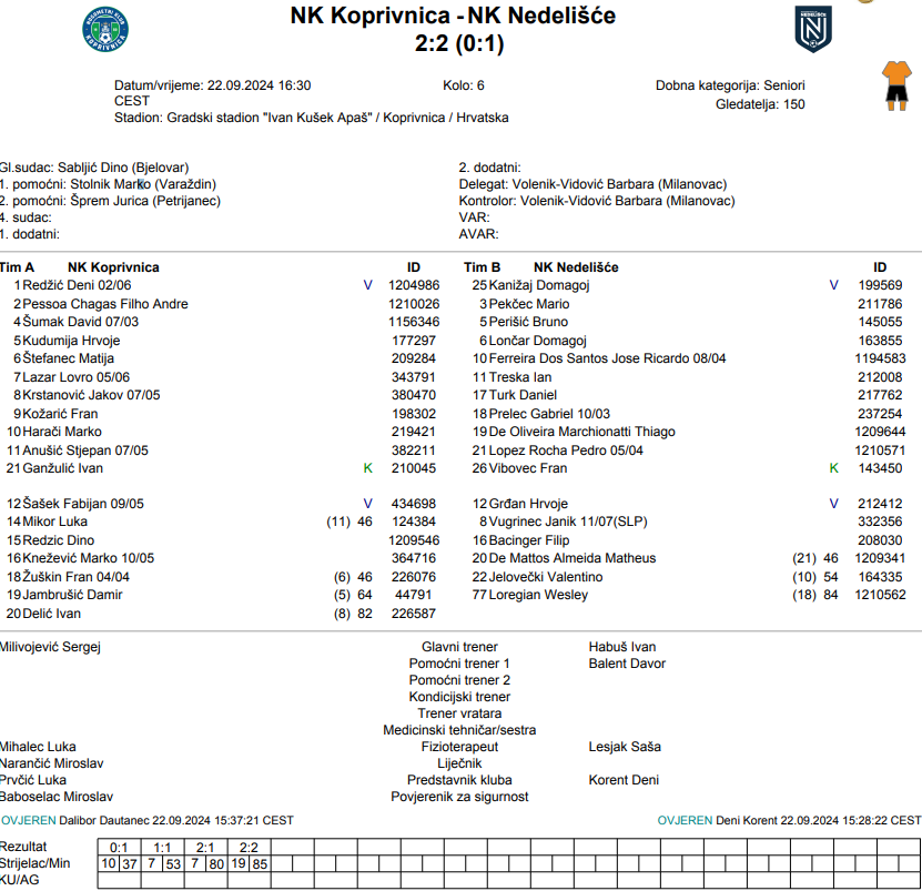 Jako dinamična utakmica kroz cijelih 90 minuta gdje ne znam da li smo osvojili jedan ili izgubili dva boda. U otvaranju utakmice domaćin se nametnuo u posjedu ali nam nisu ozbiljnije zaprijetili. U nastavku poluvremena posložili smo redove i sustavno ugrožavali njihov gol i iz jedne akcije poentirali. U drugom poluvremenu Koprivnica rastrčanija i opasnija ali mi iz jedne polukontre zabijamo za 0:2. Iz meni, neobjašnjivih razloga, drugi pomoćni sudac signalizira zaleđe. Nakon toga Koprivnica, koja je danas bila jako dobra, poravnava i zabija za vodstvo. Uspjeli smo u završnici susreta kroz izmjene unijeti živost i izjednačiti. U zadnjim minutama smo imali šansu i za 3 boda, ali domaći vratar brani veliku šansu. Čestitke igračima i jedne i druge momčadi na dobroj i atraktivnoj utakmici – Davor Balent Nedelišće.