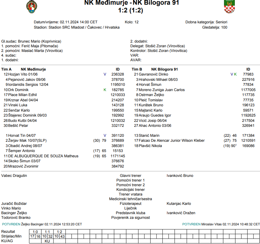 Nezaslužen poraz, trebali smo pobijediti i mislim da smo odigrali jednu od najboljih  utakmica i umjesto da vodimo s nekoliko pogodaka razlike izgubili smo utakmicu. Dečki su izvanredno igrali, ali to je nogomet. Žao mi je glave gore, imamo još tri kola i moramo to izdržati. Smatram da smo barem bod zaslužili ako ne i sva tri – Drago Vabec (Međimurje)