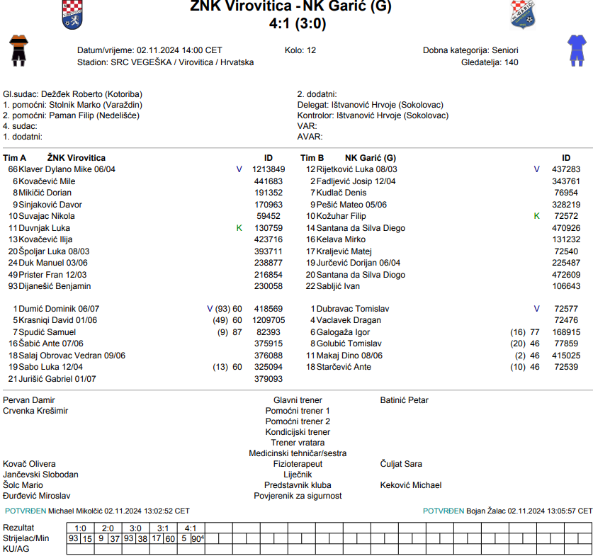 Pa eto konačno smo dočekali i pobjedu u prvenstvu. Utakmicu jako dobro otvaramo, i do poluvremena vodimo 3 – 0 i još stvaramo 2 velike prilike i gostima nismo dozvolili ništa. Dugo poluvrijeme ulazimo slabo te nakon jednog prekida gosti smanjuju na 3-1 i gužvi nakon gola nas golman dobija crveni karton, po meni jako prestrogo i ne opravdano. Međutim odigrali smo do kraja odlično te i zabili gol za 4-1 – Krešimir Crvenka Virovitica.