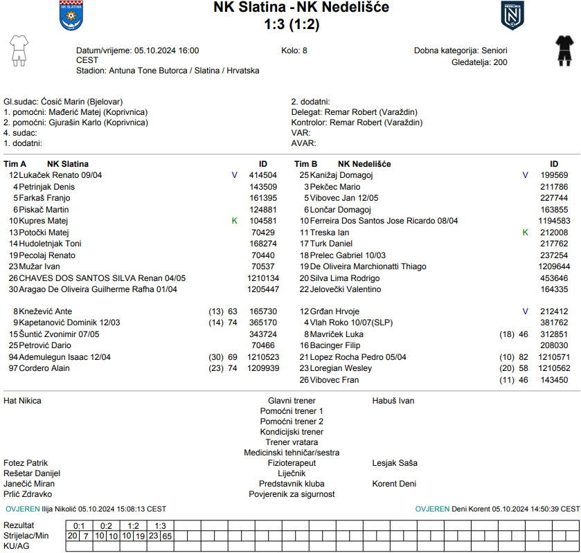 Odličan ulazak u utakmicu s naše strane i s 2 krasne akcije dolazimo u vodstvo od 2:0 i nastavljamo kontrolirati utakmicu, ali iz jedne individualne akcije domaćin smanjuje rezultat i zadnjih 20 minuta poluvremena se uvukla nekakva nervoza i domaćin nas pritisnuo izmjenama. Na poluvremenu opet smo preuzeli kontrolu u igri i 3.golom činilo se da rješavamo utakmicu, ali nakon toga zbog neobjašnjivih razloga dobivamo crveni karton i zadnjih 20 minuta smo borbenošću uspjeli sačuvati vodstvo i zasluženo osvojit 3 boda – Ivan Habuš Nedelišće.