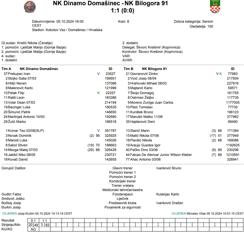 Jos sam vruć i jako mi je teško u smirenom tonu nešto izjaviti, a da se ne dotaknem bezobrazluka i cirkusa koji se danas odvijao u Domašincu. Gostima svaka čast, bili su fer i korektni cijelu utakmicu, borili su se za sebe kako smo i mi za sebe, ali niti će se danas i narednih dana pričati o njihovoj igri niti o našoj. Gosti su pokazali danas zašto su vodeći u prvenstvu, imaju kvalitetu i nekoliko izrazitih pojedinaca, ali uvjeren sam da smo danas ostali 11 na 11 da bi mi danas osvojili ne samo jedan bod, nego sva tri. Mišljenja sam da smo jako dobro pripremili utakmicu, sigurno malo iznenadili načinom igre, šteta što je teren bio natopljen vodom. Ponavljam, šteta što su od prve minute u prvom planu htjeli biti oni koji to najmanje trebaju biti, niti po znanju niti po izvedbi niti po bilo čemu drugome. Igrači su ti zbog kojih se dolazi na utakmice. Zbog kartona i isključenja nećemo naredno kolo imati Šimunića, Zulića, Rališa, od prije još i Krznara, ne znam cak dali sam ih sve pobrojao. Ali ima nas dovoljno, vjerujem da igrači koji će dobiti priliku iduće kolo će je i više nego iskoristiti. Mi idemo dalje, puno toga je pred nama, ponavljam, u ovoj godini želimo ne samo obećavati, želimo biti konkretni – Dalibor Gorupić Dinamo.