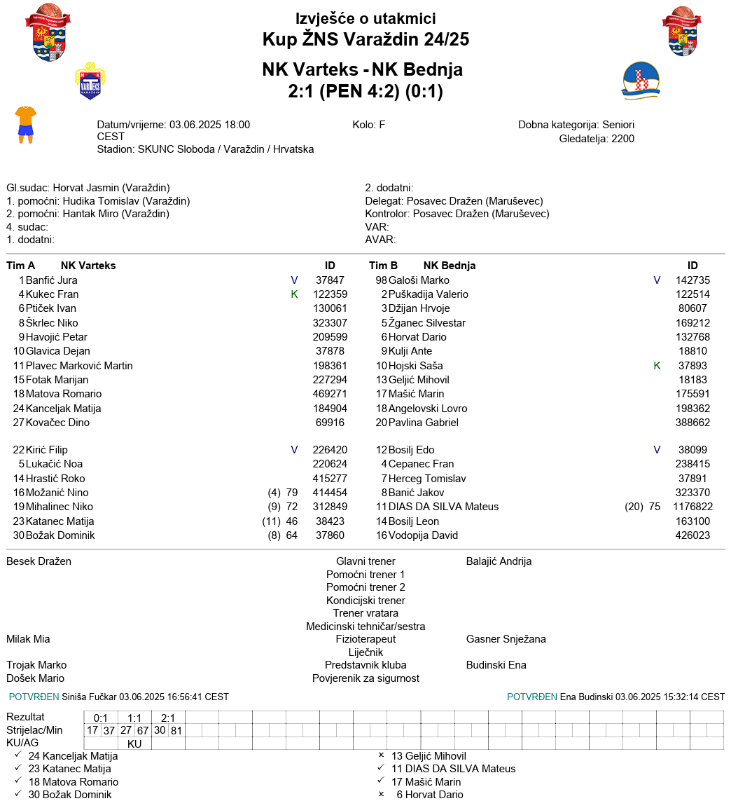 Varteks je sezonu iz snova zaključio na najbolji mogući način – osvajanjem duple krune! Nakon što su ranije osigurali naslov u Trećoj NL Sjever, jučer su osvojili i županijski kup. Pred više od 2000 gledatelja na varaždinskom stadionu Sloboda, nakon dramatične završnice i boljeg izvođenja jedanaesteraca, obranili su naslov pobjednika Kupa ŽNS Varaždin. Nakon 90 minuta igre uspjeli su nadoknaditi rezultatski zaostatak iz prve utakmice s Bednjom i u raspucavanju jedanaesteraca doći do trećeg županijskog Kupa u povijesti.